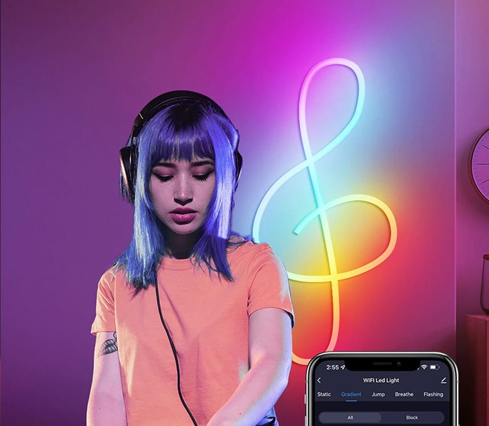 - Posiada wbudowany tryb muzyczny, który bezprzewodowo steruje oświetleniem w rytm muzyki prosto z aplikacji. Taśmy mogą także migać w rytm muzyki za pomocą wbudowanego mikrofonu w telefonie.