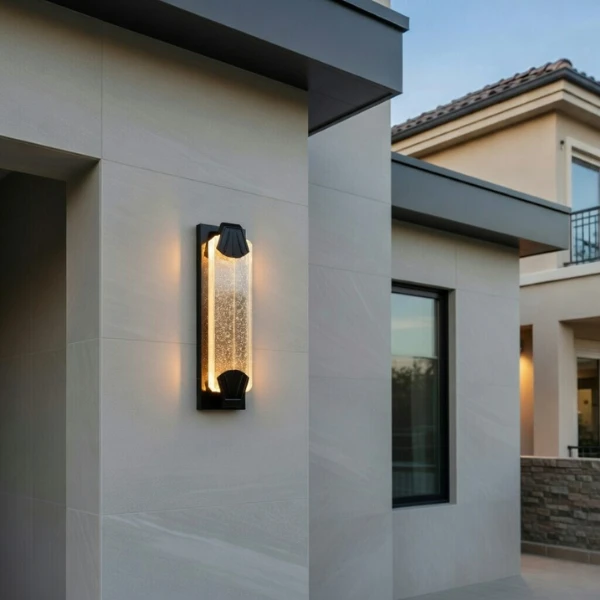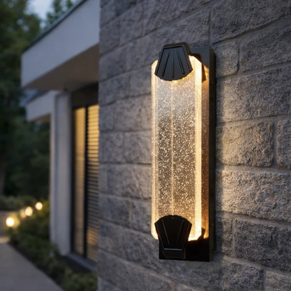 Ten wyjątkowy kinkiet zewnętrzny LED to połączenie nowoczesnego designu i efektownej gry światła. Smukła bryła lampy została uzupełniona o dekoracyjny klosz z akrylu, wewnątrz którego zatopione są subtelne „bąbelki” świetlne. Tworzą one unikalny efekt rozproszenia światła, nadając elewacji elegancki i dynamiczny charakter.