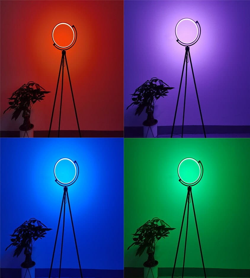 Nowoczesna lampa LED z wysokim czarnym matowym statywem o minimalistycznym wyglądzie, która wytwarza kolorowe światło.