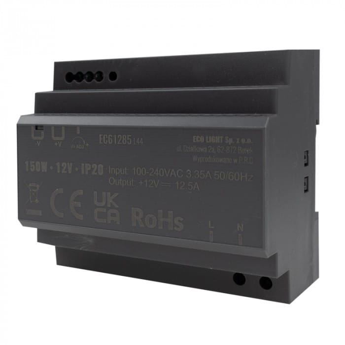 Zasilacz na szynę DIN PREMIUM 12V 150W to niezawodne źródło zasilania, stworzone z myślą o profesjonalnych instalacjach. Oferuje moc 150W przy napięciu wyjściowym 12V DC i natężeniu 12.5A. Wysoka jakość PREMIUM LINE. Kompaktowa plastikowa obudowa i montaż na szynie DIN ułatwiają instalację w rozdzielnicach. Stopień ochrony IP20 sprawia, że idealnie nadaje się do zastosowań wewnętrznych.